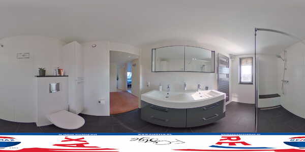 De lichte, moderne badkamer is ingedeeld met een xl-inloopdouche, tweede toilet, designradiator, een dubbele wastafel met spiegelkast en een hoge bergkast naast het toilet. De wanden zijn geheel betegeld in een lichte kleur en onder de antraciet tegels ligt elektrische vloerverwarming.