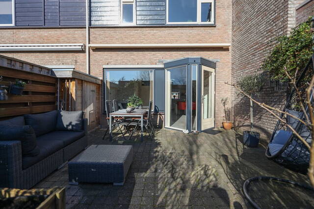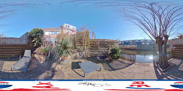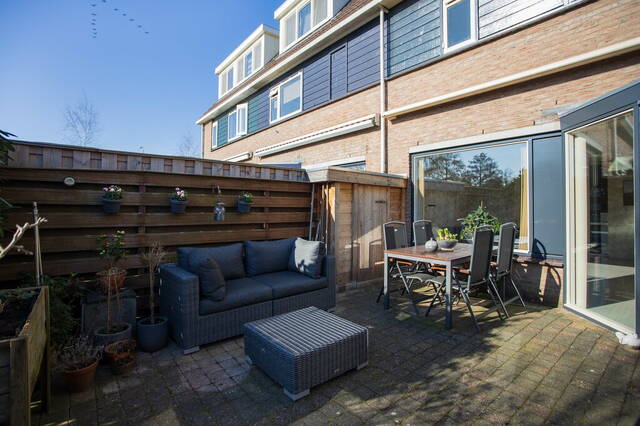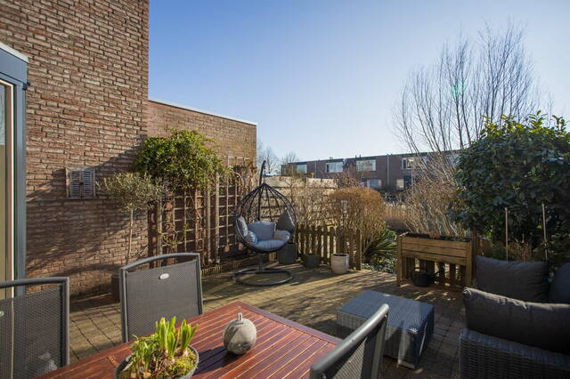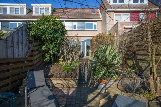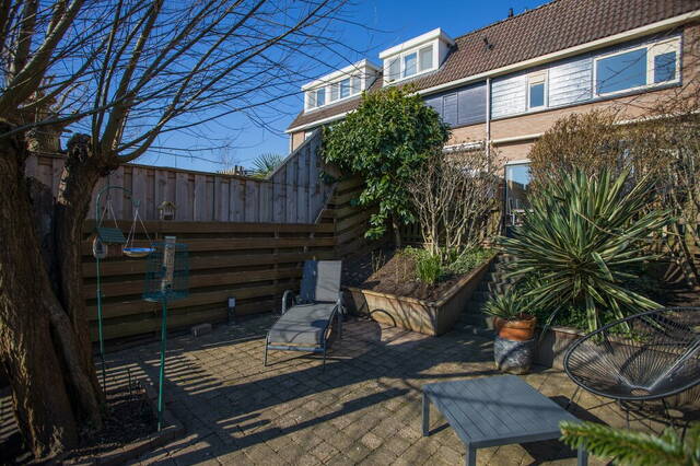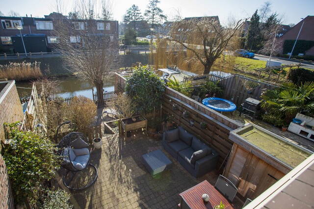 Vanuit de woonkamer stapt u de achtertuin in, gesitueerd op het zuidoosten en met een prachtige ligging aan het water. Bij het grote terras zijn een houten berging voor tuingereedschap en een brede, elektrisch bedienbare zonwering om op een warme dag in de schaduw te kunnen zitten. Via een trap in de tuin komt u op het tweede terras, omringd door diverse beplanting en aan de waterkant kunt u heerlijk genieten.