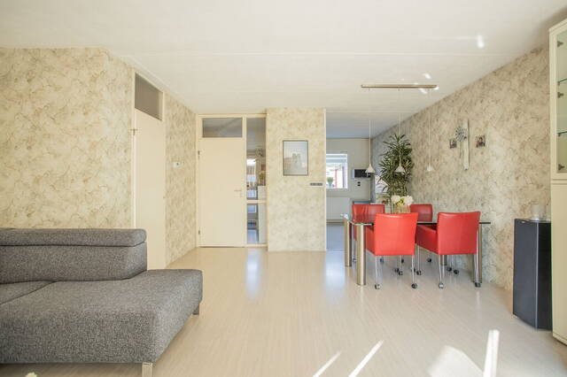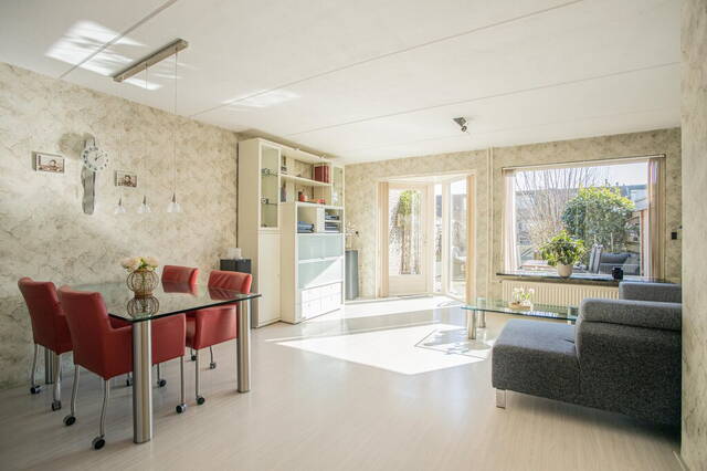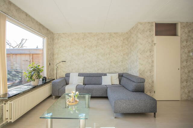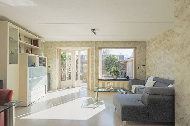 De tuingerichte woonkamer heeft een erker en een groot raam aan de zuidoostkant. Er is genoeg ruimte voor een grote hoekbank, tv-meubel en een eettafel en de deur in de erker geeft toegang tot de tuin.
