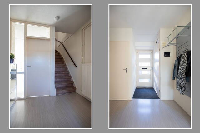 Wanneer u de auto geparkeerd heeft onder uw eigen carport loopt u naar de voordeur van deze lichte, gezellige woning. Vanuit de ruime hal zijn de woonkamer, meterkast, toiletruimte met fonteintje en de trap naar de eerste verdieping te bereiken. De Pergo laminaatvloer ligt in de hal, woonkamer en de keuken. De hal biedt genoeg ruimte voor een kapstok.