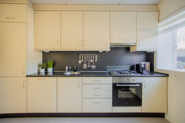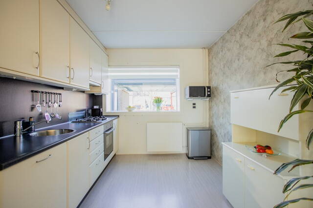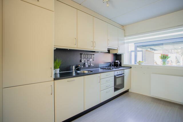 Aan de voorzijde is de halfopen keuken met een nette wandopstelling, voorzien van diverse inbouwapparatuur: een 4-pits gaskookplaat (Etna, 2020), afzuigkap, koelkast, vaatwasser en een oven (Inventum, 2020). Bij vervanging van de keuken is er genoeg ruimte voor een L-opstelling of een dubbele wandopstelling waardoor deze woning zeer geschikt is voor een kookliefhebber. Het grote raam met brede vensterbank is een mooi detail die zorgt voor veel lichtinval.