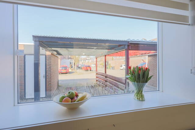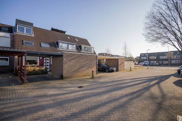 Aan de voorzijde zijn de carport en de (fietsen)berging met plek voor meerdere fietsen en/of een scooter. De rest van de voortuin is bestraat waardoor u hier weinig onderhoud heeft.