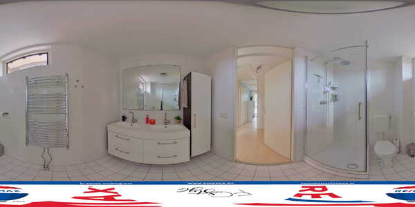 De laatste ruimte op deze verdieping is de badkamer. Zowel de wanden als de vloer zijn in een lichte kleur betegeld en de ruimte is ingedeeld met een douche (2013), tweede toilet, handdoekenradiator en een dubbele wastafel met meubel. Boven de wastafels hangt een grote spiegel en in de voorgevel ziet u een groot raam.