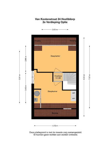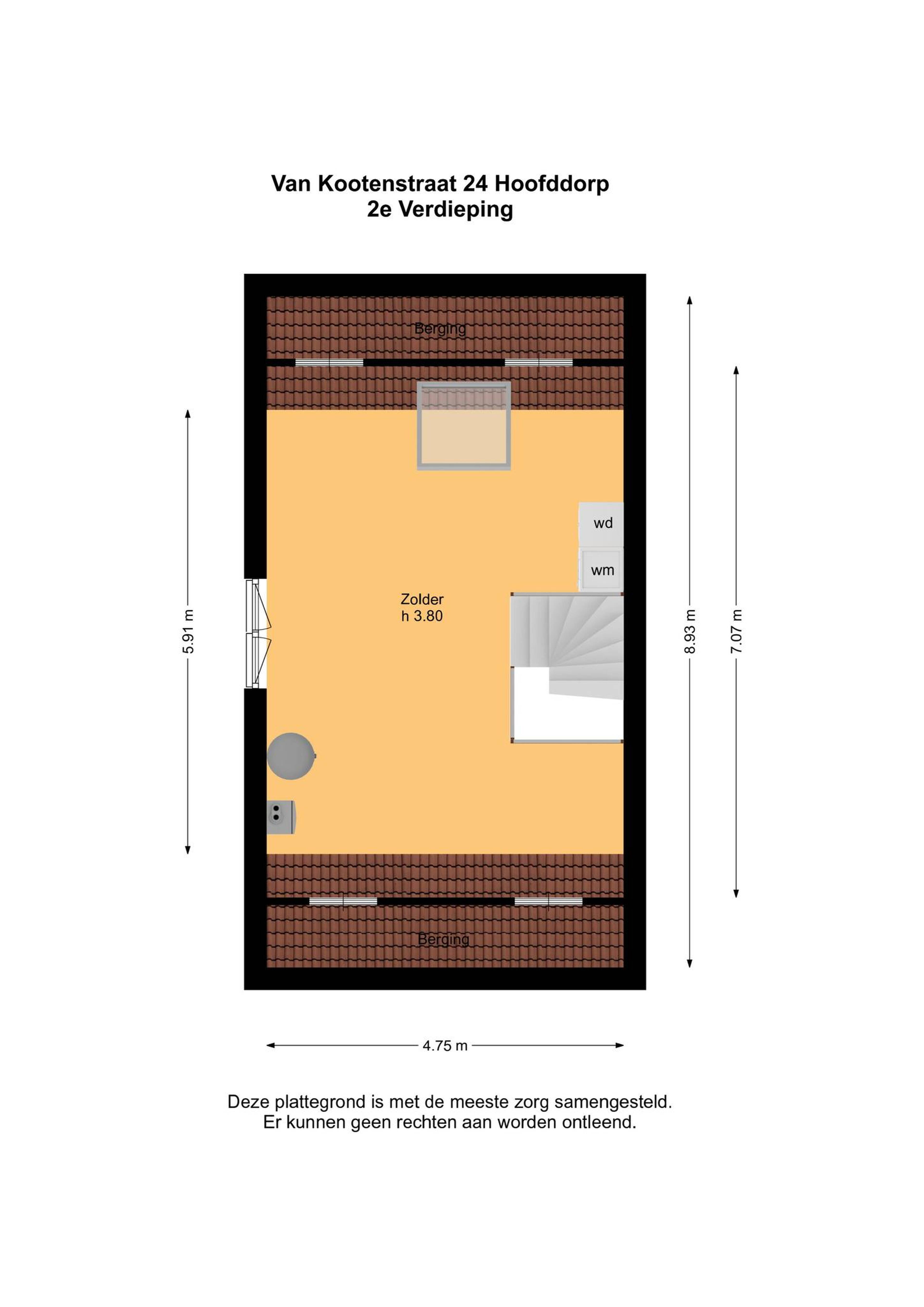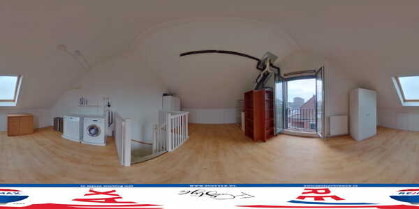 Een vaste trap geeft toegang tot de zeer ruime zolderkamer met dubbele deuren naar een Frans balkon in de zijgevel, een dakraam aan de achterzijde en bergruimte in de schuinte van het dak. De nokhoogte is maar liefst 3.80 meter en ook op deze verdieping ligt zeil op de vloer. Verder bevind zich op deze verdieping de technisch ruimte en naast de trap zijn de aansluitingen voor de wasmachine en droger.
