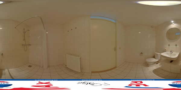 Vanaf de overloop stap je de tweede badkamer in met een douchehoek, derde toilet en een wastafel. Zowel de wanden als de vloer zijn geheel betegeld in een lichte kleur.