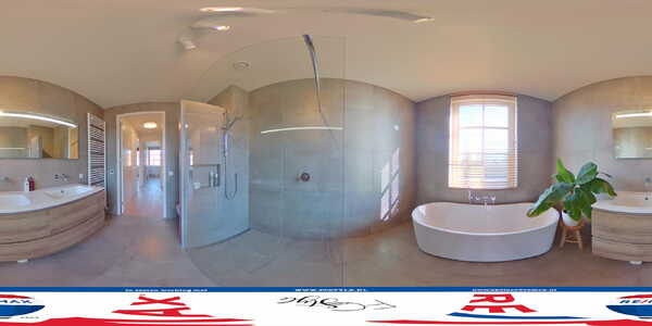 De badkamer heeft de sfeer en luxe van een vijfsterrenhotel. Onder het raam staat het bad en links in de badkamer is de zeer ruime inloopdouche. Verder heeft deze badkamer een tweede toilet en een breed wastafelmeubel met twee wastafels, wandkranen en een brede, verwarmde spiegel. Onder de grote, grijze vloertegels ligt vloerverwarming.