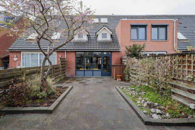 Thanks to the depth of the backyard you can sit here in the sun or shade. There is room for a garden table with chairs and a lounge set so you can sit here with friends or family. In the back of the garden you will find a stone bicycle shed and a canopy with a double wide gate to the alley.