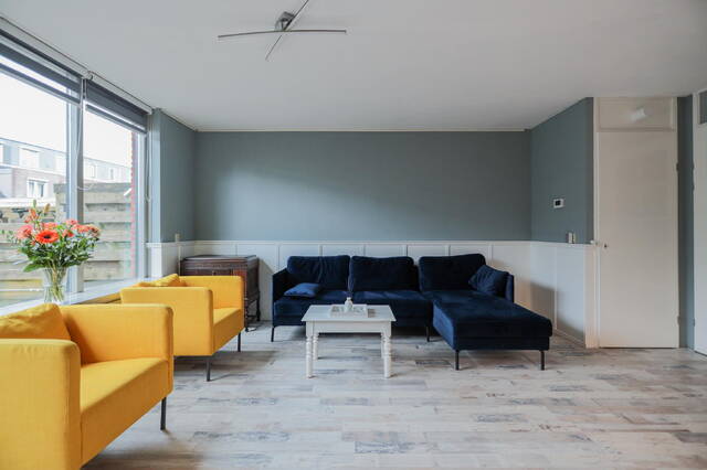 De woonkamer is een nagenoeg vierkante, sfeervolle leefruimte met grote ramen aan de tuinzijde en een deur naar het terras. Ook hier zorgen de kleuren op de muren, die goed passen bij de laminaat-vloer, voor een woonkamer met karakter en sfeer. Ziet u zichzelf hier al wonen?