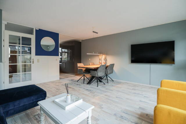 The living room is a nearly square, cozy living space with large windows on the garden side and a door to the terrace. Again, the colors on the walls, which fit very well with the laminate flooring, create a living room with character and atmosphere. Do you picture yourself living here already?