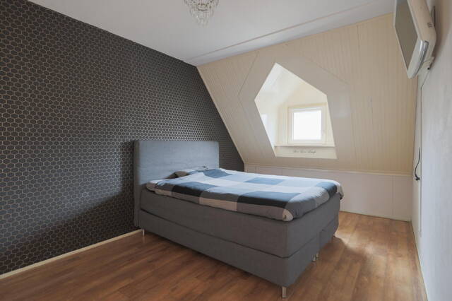 On the second floor are the landing, three bedrooms and the bathroom. Nice detail are the dormers at the rear which make the bedrooms very light and attractive. It is possible, like the neighbors, to place a roof structure to make the bedrooms even larger. On the landing and in the bedrooms is a brown laminate flooring with wood pattern, which fits well with the wallpaper and paint on the walls.