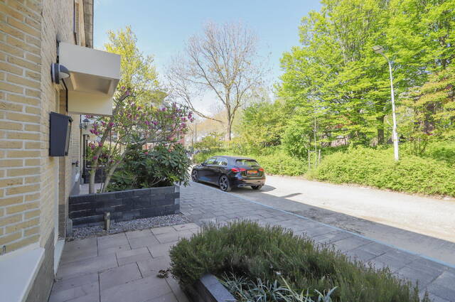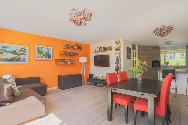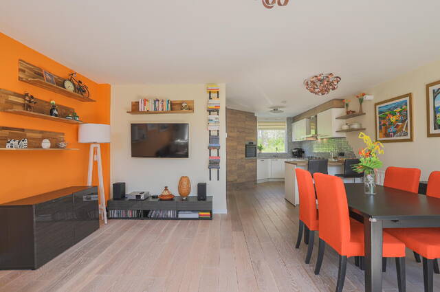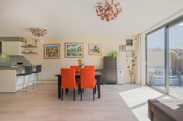 De woonkamer biedt 25m2 aan zonnige, mooi afgewerkte leefruimte. Er is een massief houten vloer en de grote tuingerichte raampartijen zorgen voor een fijne daglichttoetreding. Via de schuifpui loopt u bovendien eenvoudig de achtertuin in, zodat binnen en buiten heerlijk in elkaar overlopen. Dit ruimtelijke gevoel wordt nog verder vergroot door de in 2020 geheel vernieuwde open keuken. Deze staat in een mooie open verbinding met de woonkamer door de grote ontbijtbar, die ideaal fungeert als eetplek en die tevens extra werkruimte biedt voor tijdens het koken. De keuken geniet een hoogwaardige en moderne afwerking met een stijlvolle houten keukenwand, inbouwspots in de wandkasten en diverse inbouwapparatuur als een 5-pits gaskookplaat, vaatwasser, oven, koelkast en een vriezer. De ramen hier bieden een leuk uitzicht op de voortuin en de boomrijke groenstrook tegenover de woning.