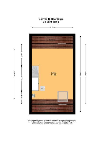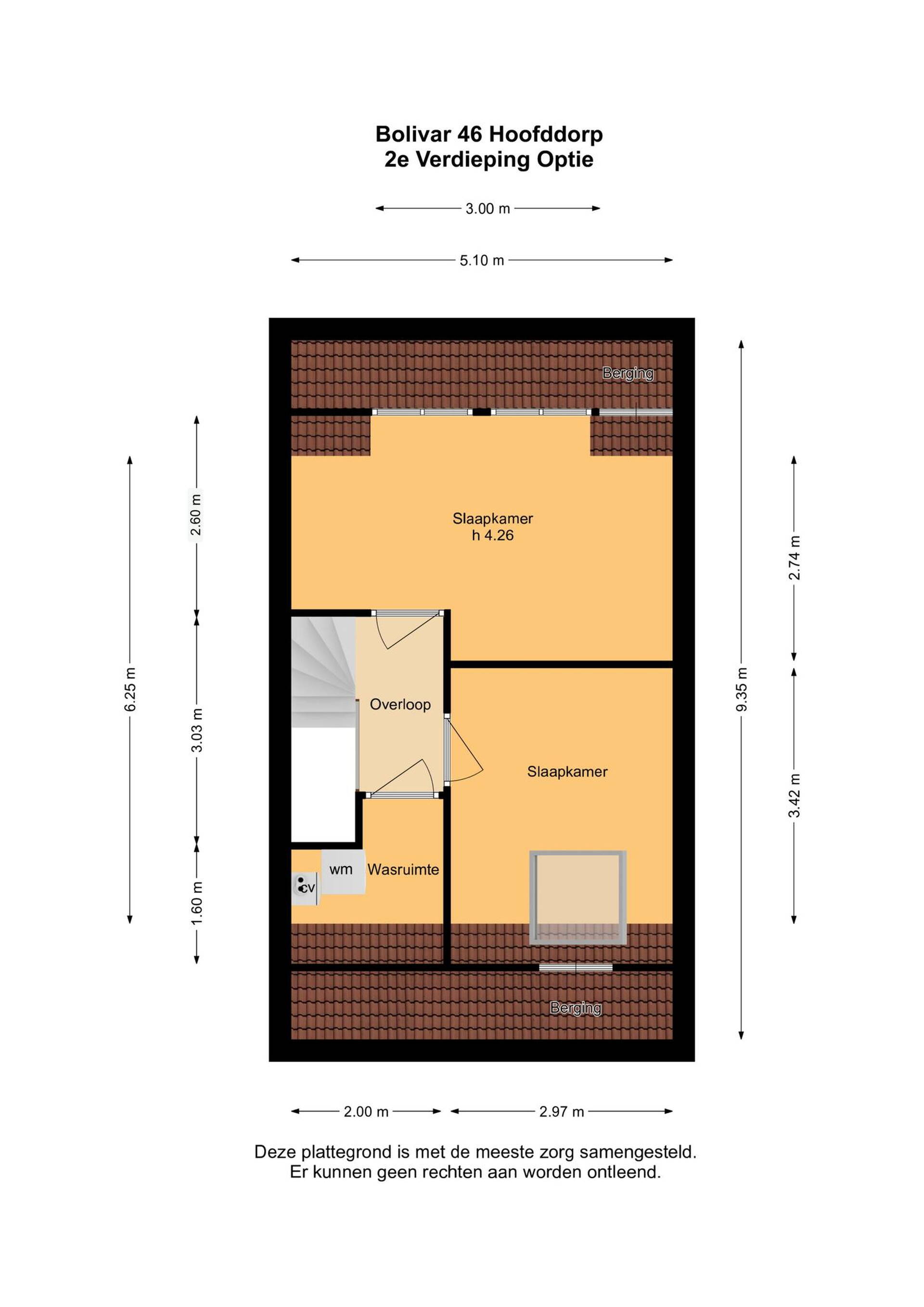 Een vaste trap geeft toegang tot de enorme zolderkamer met een nokhoogte van maar liefst 4.26 meter, een groot dakraam aan de voorzijde en bergruimte in de schuinten van het dak. Op de vloer ligt laminaat en hier zijn de aansluitingen voor de wasapparatuur. Gezien de grootte van deze verdieping is het mogelijk om twee slaapkamers, een wasruimte en een bergzolder te realiseren.