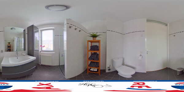 The bathroom has a large window on the southwest side, making the room look very light and spacious. The walls are fully tiled in a light color and the dark gray square tiles on the floor give the bathroom a beautiful look. The space is divided with a walk-in shower, second toilet and a washbasin (2017).