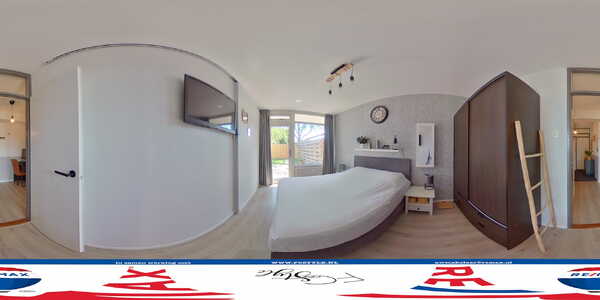 Het appartement heeft een ruime slaapkamer met een deur naar de tuin en genoeg ruimte voor een garderobekast plus een tweepersoonsbed. Op de vloer ligt hetzelfde laminaat als in de woonkamer en de hal.