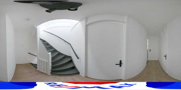 At the front you will see the door to the hallway and a second door, which gives access to the storage room. In the spacious, bright hallway, the walls and ceiling are painted white, which goes well with the laminate flooring and gray staircase. Under the stairs is room for a coat rack and behind one of the doors is the modern toilet. This space is divided with a wall closet, sink, stucco and large tiles on the walls and floor.