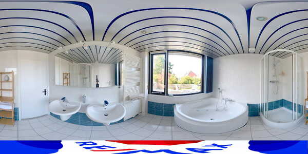 The spacious bathroom is arranged with a corner bath, separate shower, two sinks, a three-door mirror cabinet and a towel radiator. The suspended ceiling has recessed lighting, The whirlpool of the bath does not function, but of course you can use the bath.