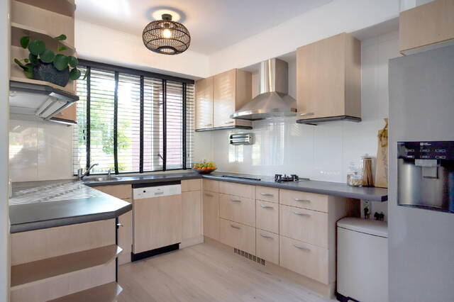 De open keuken heeft een U-opstelling met een grijs aanrechtblad, veel bergruimte en het merendeel van de apparatuur is ingebouwd: een inductie kookplaat met wokbrander, een afzuigkap, vaatwasser en een oven.