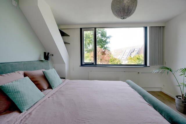Gezien de grootte van de slaapkamer is het mogelijk om deze te splitsen in twee (slaap)kamers. Dan heeft de kamer aan de voorzijde een dakraam en de kamer aan de achterzijde een 4 meter brede dakkapel. Op de vloer ligt laminaat en onder de ramen van de dakkapel kunt u woonaccessoires neerzetten.