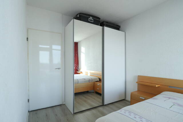 Het appartement heeft een ruime slaapkamer met een deur naar het balkon en genoeg ruimte voor een garderobekast plus een tweepersoonsbed. Op de vloer ligt hetzelfde laminaat als in de woonkamer en de hal.