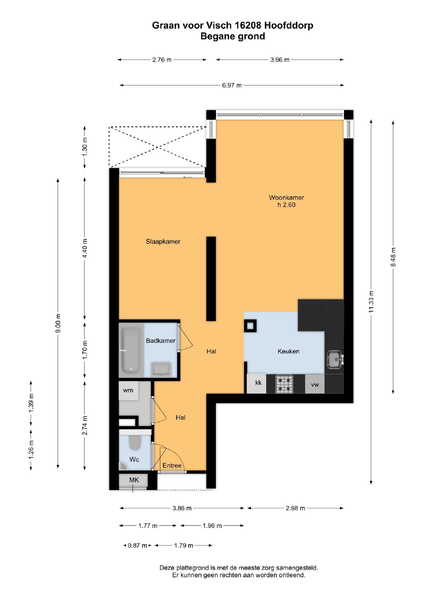 Dit instapklare appartement heeft een ruime hal waar zich aan de linkerkant het toilet met fonteintje, de badkamer met ligbad en de inpandige berging bevinden. De hal staat in halfopen verbinding met de woonkamer, keuken en slaapkamer.