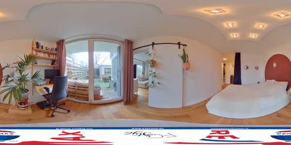 Het appartement heeft een ruime slaapkamer met een schuifdeur naar de tuin en genoeg ruimte voor een garderobekast plus een tweepersoonsbed. Op de vloer ligt hetzelfde lamelparket als in de woonkamer en de hal.