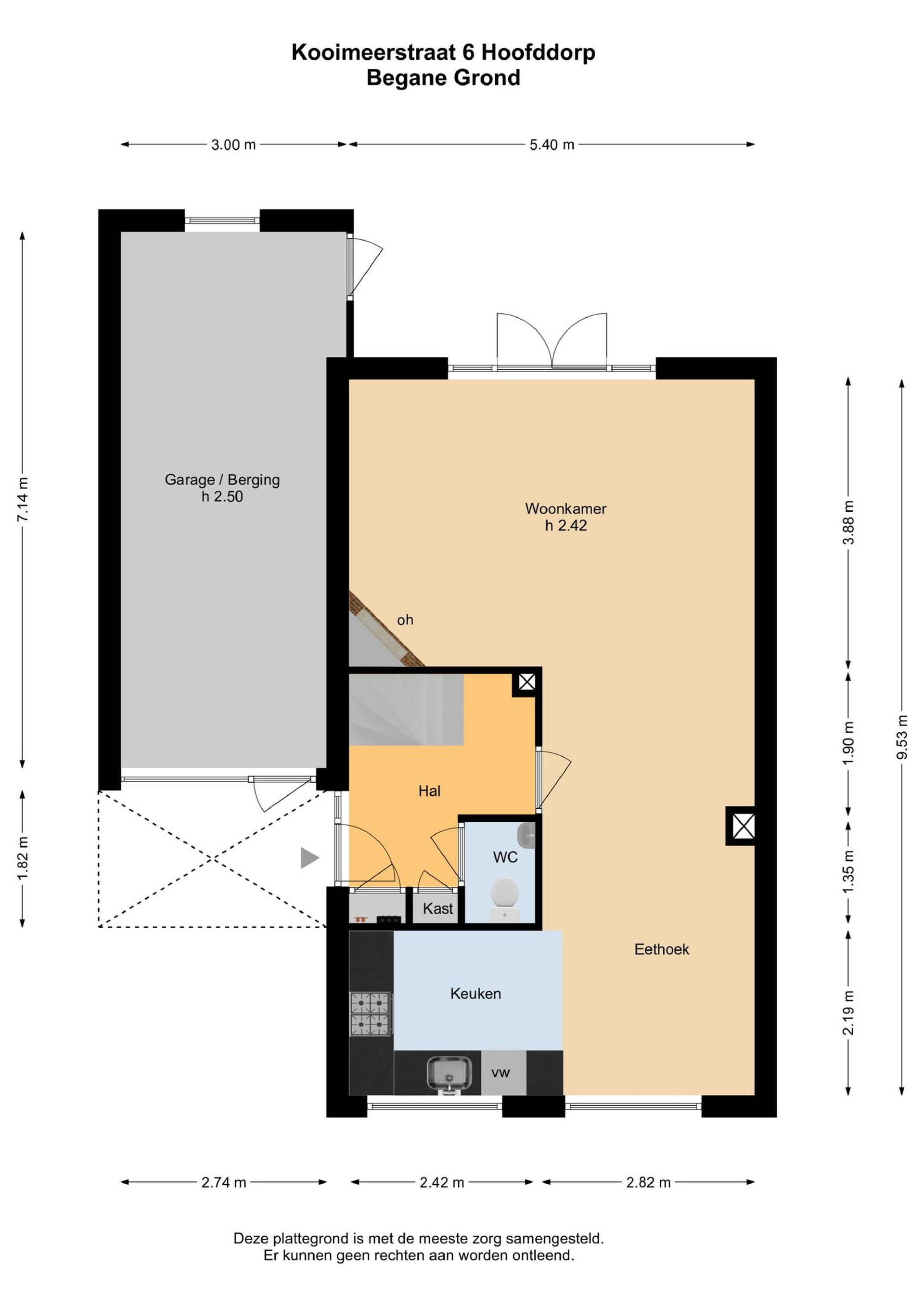 Links van de woning staat een meer dan 7.10 meter diepe garage/berging, voorzien van elektra. In de garage zijn een deur naar de tuin en een kantelpoort met loopdeur naar de oprit. Voor de auto, fietsen, motor, scooter en andere spullen is dit een fantastische plek.