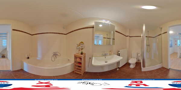 De ruime badkamer is fraai ingedeeld met een ligbad, aparte douche, een tweede toilet en een wastafel. Zowel de wanden als de vloer zijn geheel betegeld in een mooie kleurstelling. Boven de wastafel hangt een spiegelkast met verlichting.