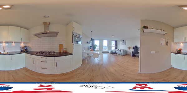 De ruime woonkamer met open keuken bevindt zich aan de zuidwestkant, waar de middag- en avondzon naar binnen valt. Doordat er geen bebouwing direct aan de overzijde van de straat is, kijkt u over de laagbouw ver weg over het eiland. Een grote hoekbank, tv-meubel, bureau en een eettafel kunnen hier prima staan.