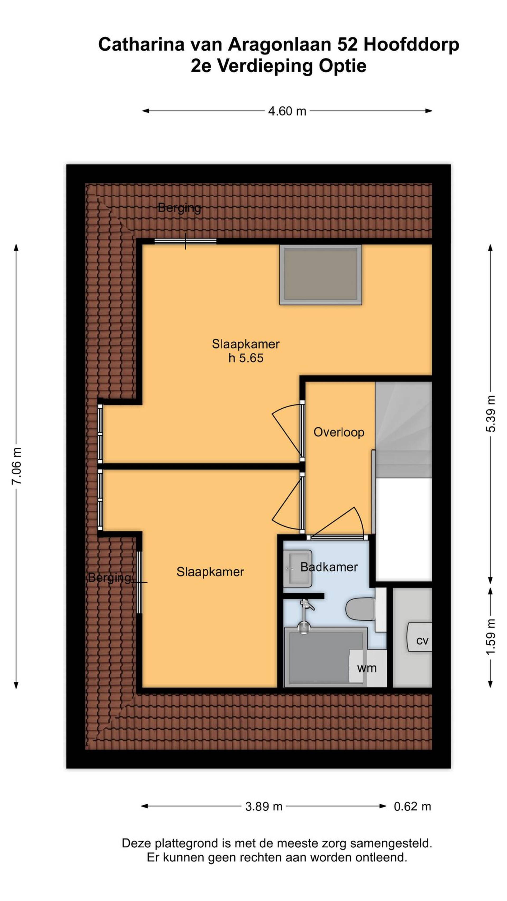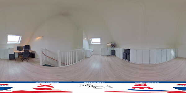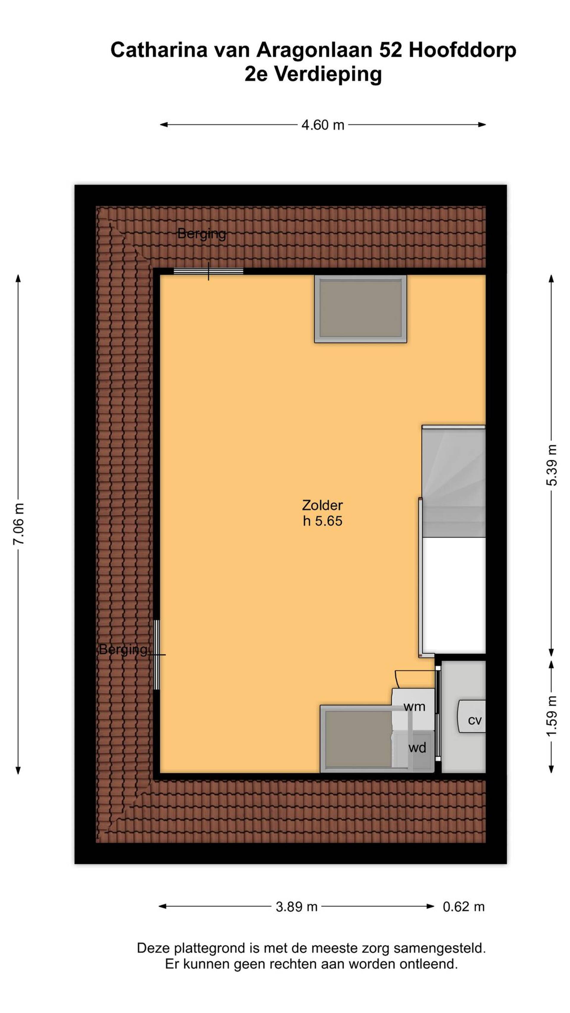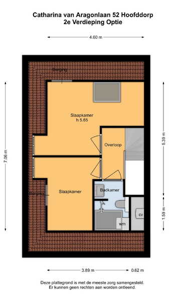 Een vaste trap geeft toegang tot de zeer ruime tweede verdieping met een nokhoogte van maar liefst 5.65 meter. Nu is dit één grote ruimte met twee dakramen en bergruimte in de schuinten van het dak. We hebben een extra plattegrond laten maken, waarop de potentie van deze verdieping in beeld is gebracht. Zo kunnen er twee slaapkamers, een tweede badkamer en een bergvliering gerealiseerd worden.