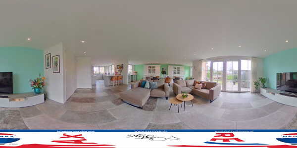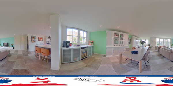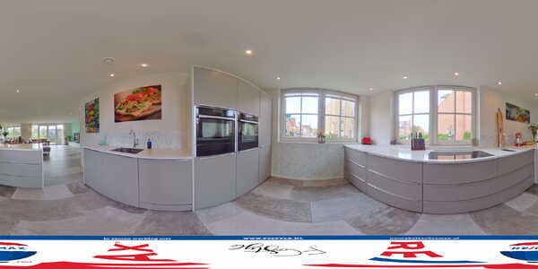 Aan de voorzijde is de prachtige, luxe keuken van groot formaat. Door de enorme ramen valt veel licht naar binnen en de luxe keukenopstelling met zitgelegenheid is de perfecte plek voor de kook- en bakliefhebber. Het Ceasarstone composiet aanrechtblad past goed bij de kleur van de keuken, die volop bergruimte biedt. Alle denkbare apparatuur van topkwaliteit is ingebouwd: een inductie kookplaat (Siemens), downdraft-Wave afzuigkap met externe motor, een vaatwasser (Siemens), koelkast (Liebherr), vriezer (Liebherr), stoomoven met warmhoudlade (Neff) en een oven (Neff).