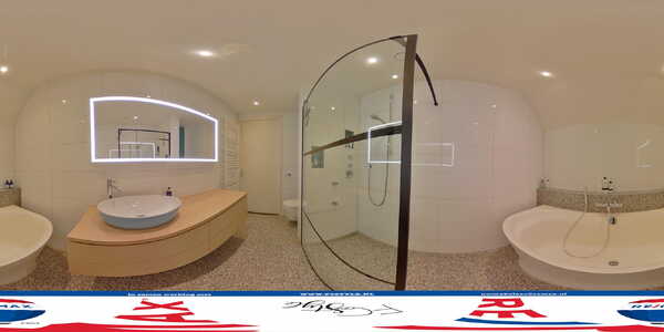 Ook de badkamer is het toppunt van luxe en sfeer. De ruimte, gemaakt in 2016 en deels vernieuwd in 2022, is ingedeeld met Villeroy & Boch sanitair, mooie kranen en stijlvol tegelwerk. U heeft niet alleen de beschikking over een inloopdouche met wandstralen, maar ook over een fraai vormgegeven bad. Verder ziet u een prachtig wastafelmeubel met een waskom, een grote spiegel met verlichting, een handdoekenradiator en een nis met wandcloset. Ook dit toilet is voorzien van geïntrigeerde geurafzuiging.