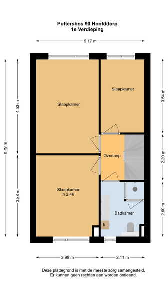 Vanaf de overloop zijn drie slaapkamers en de badkamer te bereiken. Op bijna de hele verdieping ligt laminaat, in een lichte kleur en van extra brede delen. Aan de achterzijde zijn twee slaapkamers en de derde, eveneens ruime slaapkamer is aan de voorzijde. Een van de kamers is in gebruik als kleedruimte.