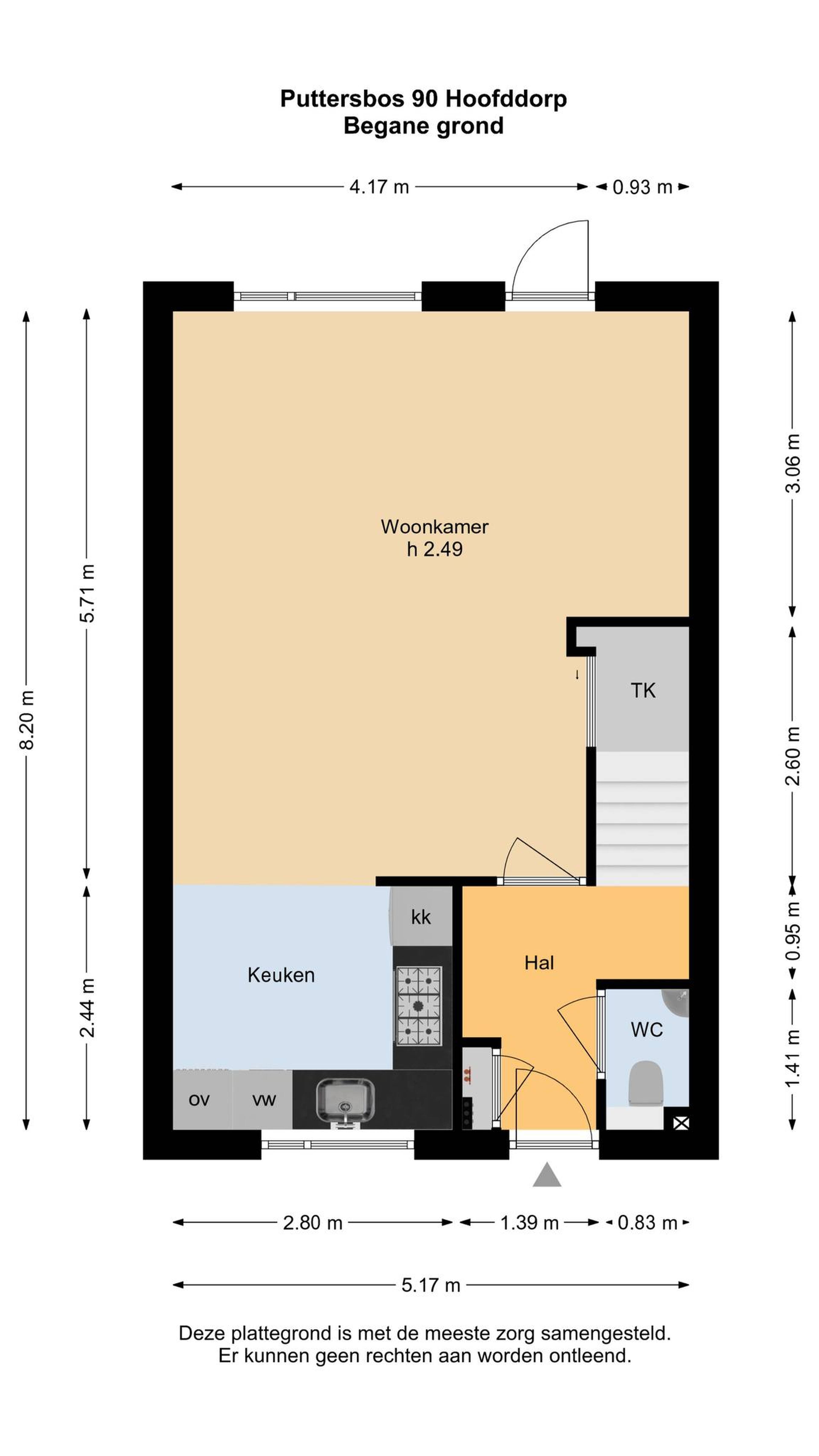In de hal, boven de radiatorombouw, is ruimte voor een kapstok. Aan de andere zijde zijn de toiletruimte met fonteintje en de trap naar de eerste verdieping. Onder deze trap is een handige bergkast, te bereiken vanuit de woonkamer. In de hal, woonkamer en keuken ligt laminaat in een mooi patroon.