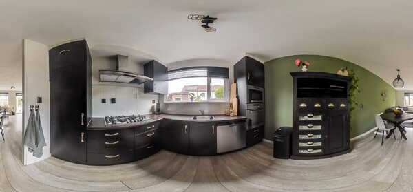 Via het eetgedeelte loopt u de keuken in, waar een royale hoekopstelling staat. Voorheen had de keuken een lichte kleur, maar deze is door de huidige bewoners in trendy zwart geschilderd. Alle apparatuur is ingebouwd: een 5-pits gaskookplaat, afzuigkap, Siemens vaatwasser (2020), koel-/vriescombinatie, oven en een magnetron.