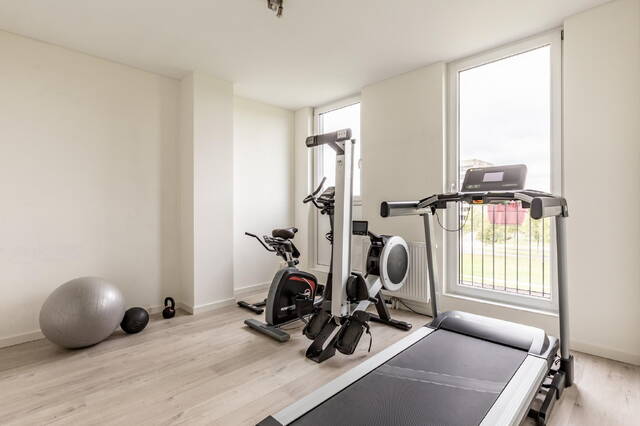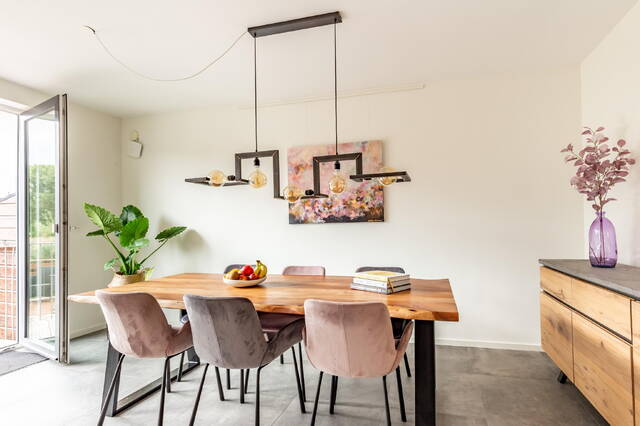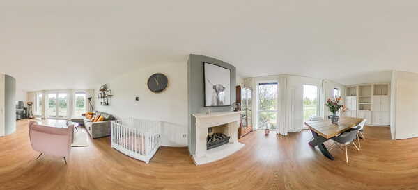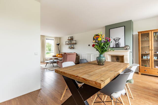 De ruime woonkamer, voorzien van een houten vloer en een open haard, heeft grote ramen van vloer tot plafond, wat zorgt voor veel licht. Vanuit de woonkamer heb je een prachtig uitzicht op de groene omgeving.