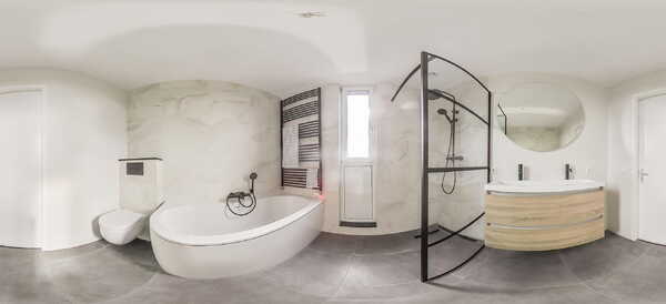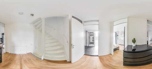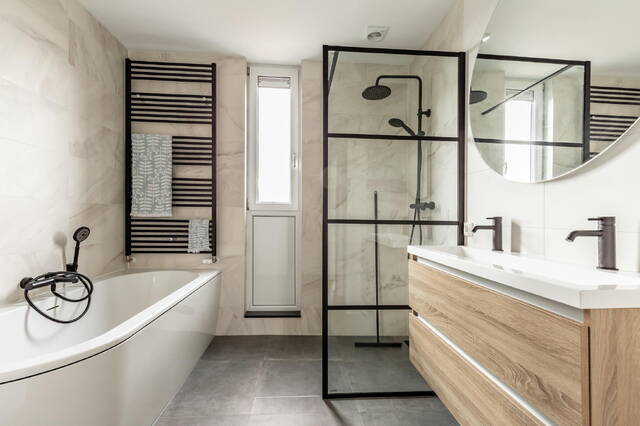 Via een vaste trap kom je op de overloop, met aangrenzend drie slaapkamers en de tweede badkamer. Deze badkamer, in dezelfde stijlvolle afwerking als de andere badkamer, is uitgerust met een ligbad, inloopdouche, toilet en wastafelmeubel met dubbele wasbak.