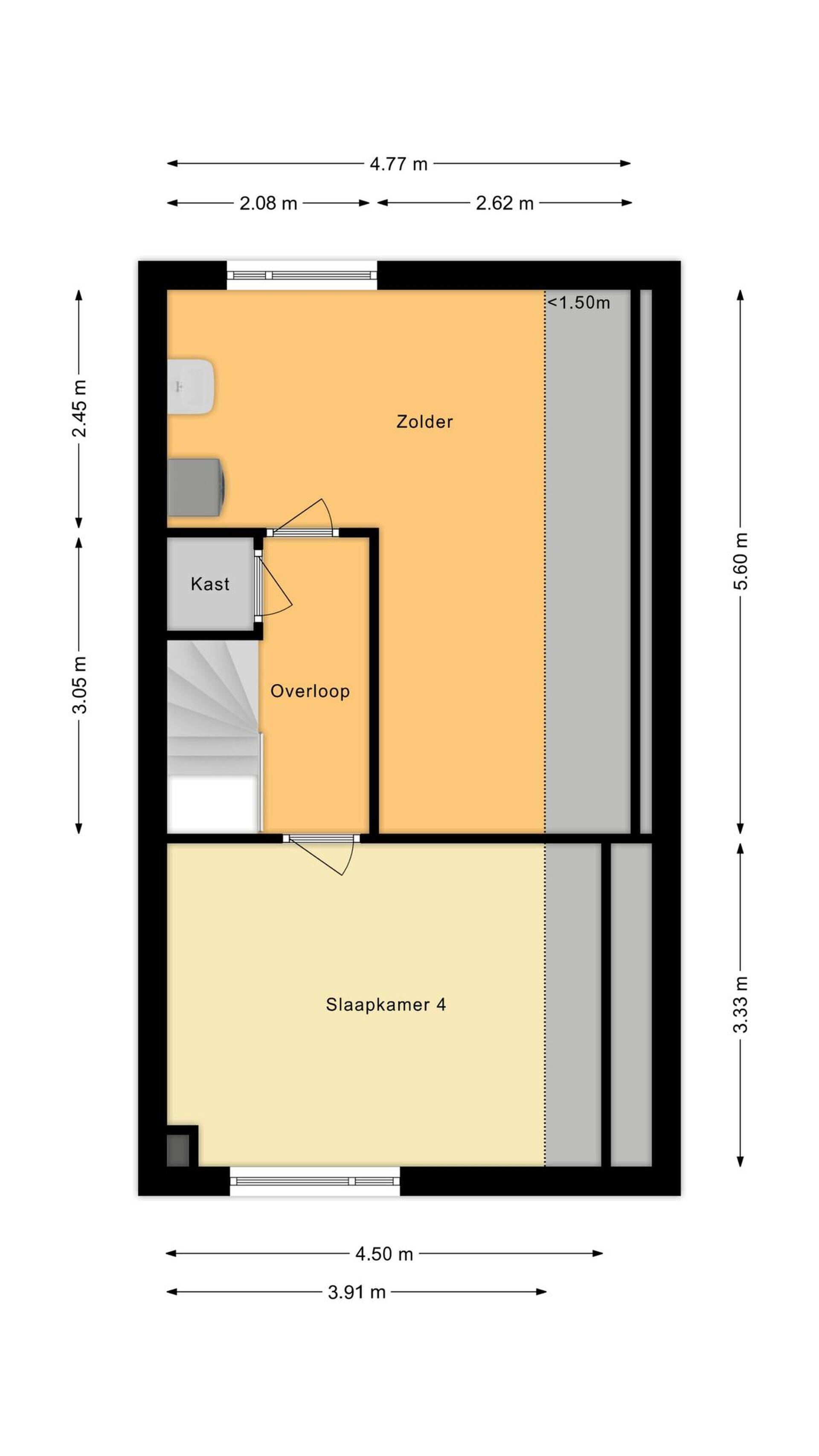 Op de eerste verdieping bevinden zich drie goed formaat slaapkamers, allemaal even licht en ruim, ideaal voor opgroeiende kinderen of als thuiswerkplek. De zolderverdieping, te bereiken via een vaste trap, biedt nog een vierde slaapkamer én de mogelijkheid om een vijfde kamer te creëren. Extra opbergruimte nodig? Geen probleem, want ook daarvoor is hier genoeg plek.