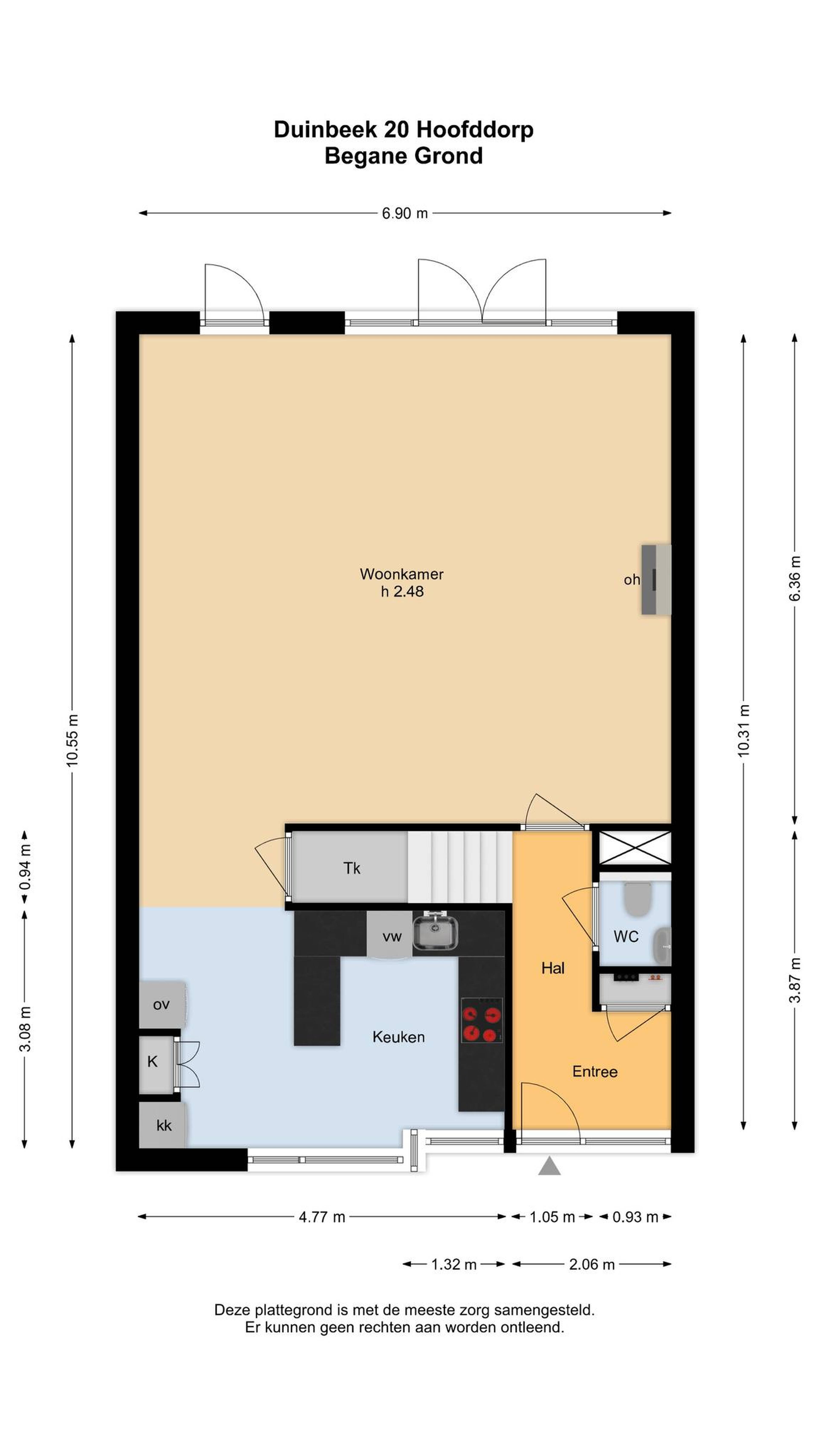 Via de ruime voortuin, met parkeergelegenheid voor twee auto's, bereik je de voordeur. De hal geeft toegang tot de meterkast, een toilet met fontein, garderobe, trapopgang en de ruime woonkamer.