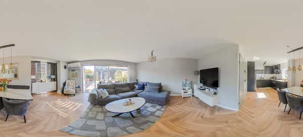 De lichte en sfeervolle woonkamer met erker is tuingericht en voorzien van een fraaie visgraat vloer, airconditioning, gestucte wanden en een handige trapkast. De grote raampartijen zorgen voor veel natuurlijk lichtinval.