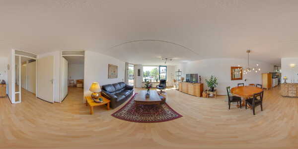 Aan het einde van de hal bevindt zich de deur naar de ruime en lichte woonkamer. Op de vloer ligt een nette laminaatvloer die doorloopt in het hele appartement wat voor een mooi geheel zorgt. De wanden zijn afgewerkt met behang.