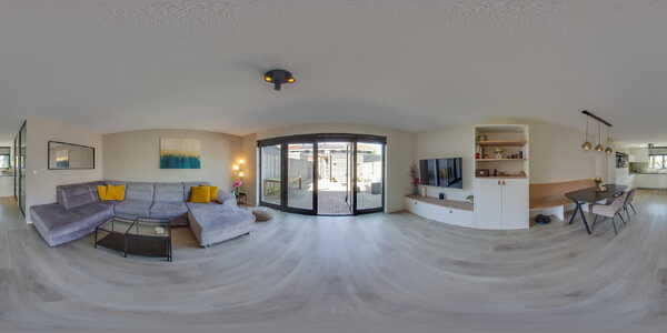 De woonkamer is een stijlvolle leefruimte met een grote pui (2020) aan de tuinzijde, voorzien van openslaande deuren naar de zonnige tuin. Bij het eetgedeelte is er een tv-meubel, hoge kast en een bank (2020), alles van eikenhout en op maat gemaakt, speciaal voor deze woning. Onder de trap is een bergkast met veel bergruimte voor diverse spullen.