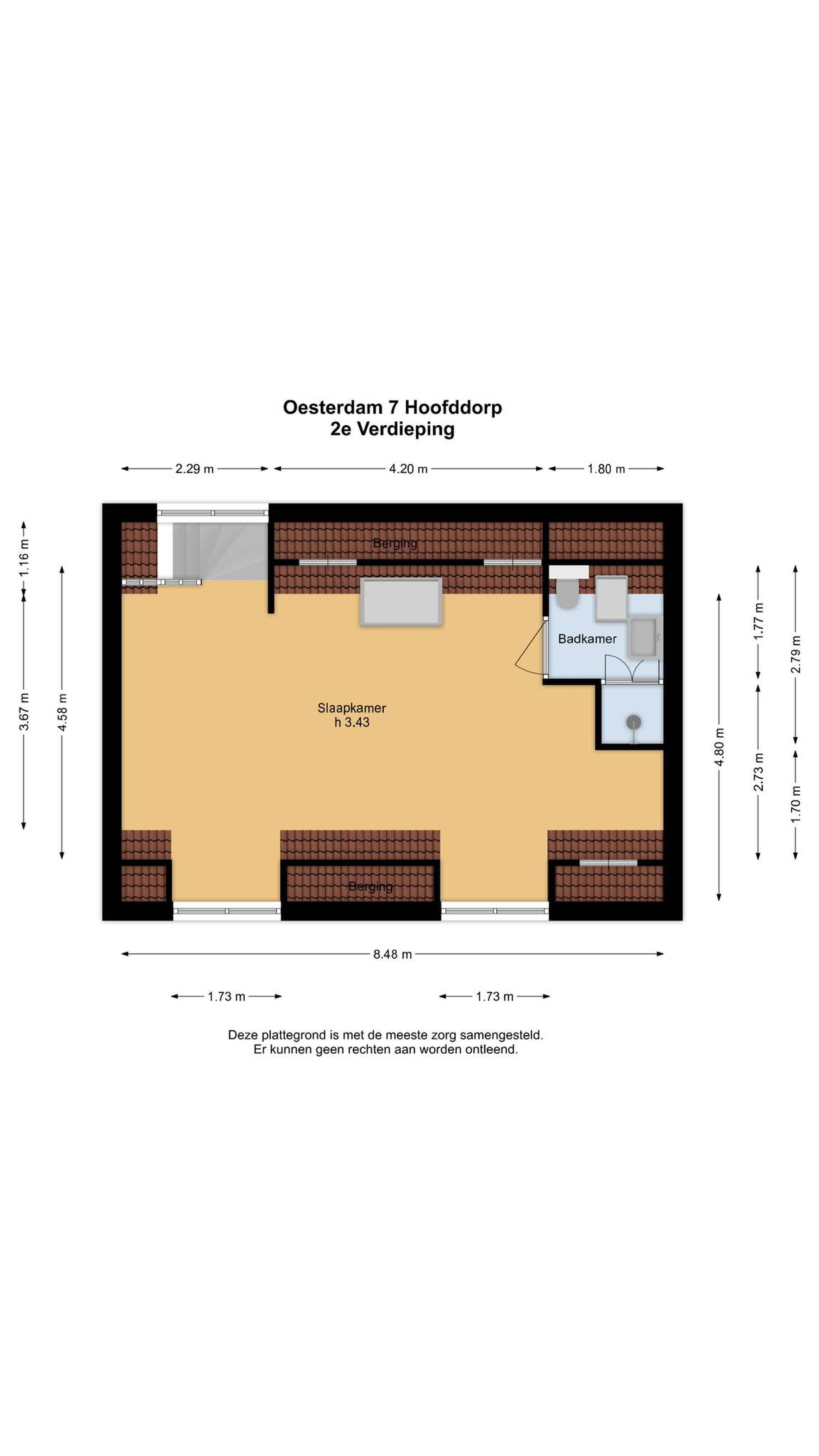 Deze verdieping biedt toegang tot een royale vierde slaapkamer van ca. 34 m². Hier bevindt zich tevens de tweede badkamer, voorzien van een toilet, wastafelmeubel en inloopdouche. De hoge nok en de grote ramen zorgen voor een bijzonder lichte en aangename ruimte, met de mogelijkheid tot het creëren van een extra (vijfde) slaapkamer of werkruimte.