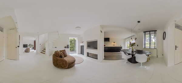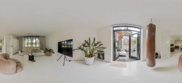 De woonkamer, gelegen aan de linkerzijde van de woning, heeft een prettig uitzicht op de achtertuin en biedt via dubbele openslaande deuren directe toegang tot buiten. Deze ruimte is royaal bemeten en kent net als de gehele woning een fijne lichtinval dankzij de grote raampartijen.