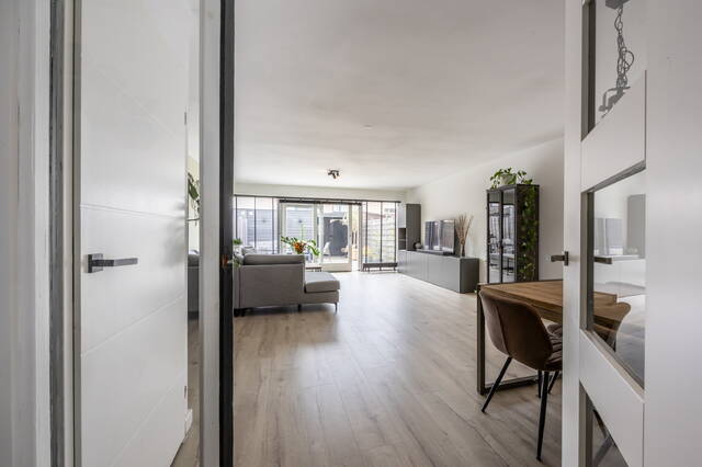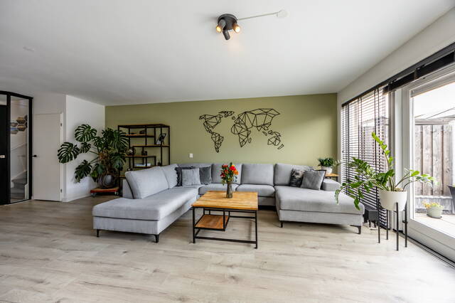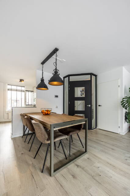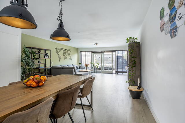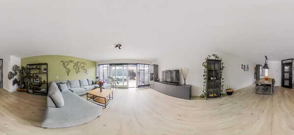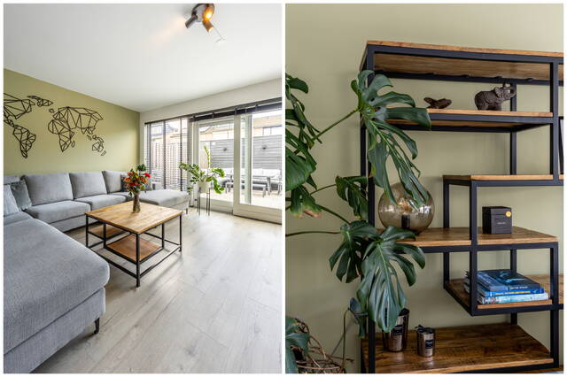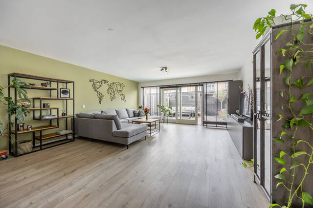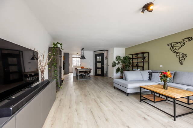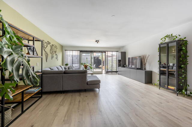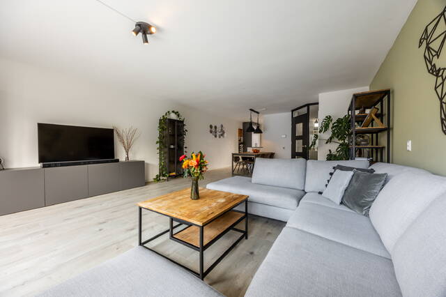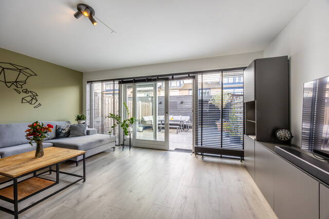 De tuingerichte en uitgebouwde woonkamer is voorzien van een laminaatvloer in lichte kleurstelling en behaaglijke vloerverwarming. De muren zijn strak gestuct in neutrale tinten en de grote raampartijen zorgen voor veel natuurlijk licht. De indeling is praktisch, met voldoende ruimte voor een royale zithoek en een eethoek. De schuifpui aan de achterzijde zorgt voor een mooie verbinding met de tuin – ideaal tijdens zomerse dagen wanneer binnen en buiten in elkaar overlopen.