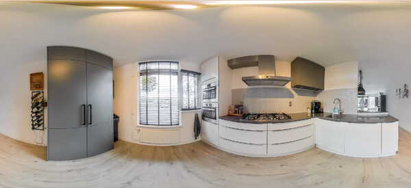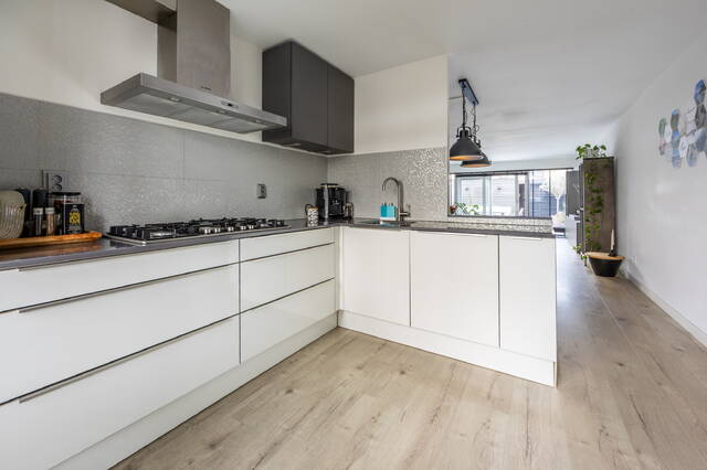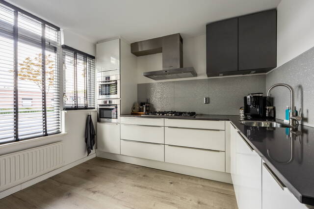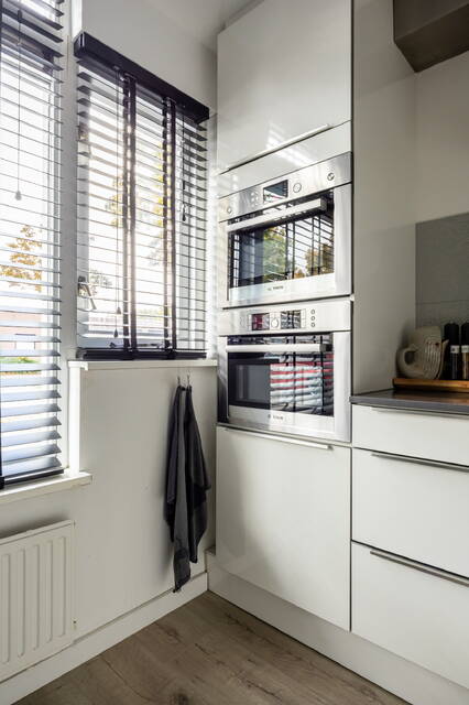 Aan de voorzijde bevindt zich de open keuken in hoekopstelling, voorzien van diverse inbouwapparatuur, waaronder een gaskookplaat, afzuigkap, oven, combimagnetron, koel-vriescombinatie en vaatwasser. Een fijne plek voor wie graag kookt en toch in contact wil blijven met de rest van het gezin of gasten.