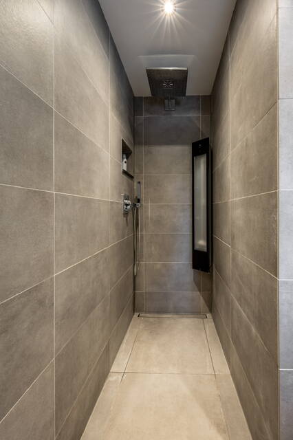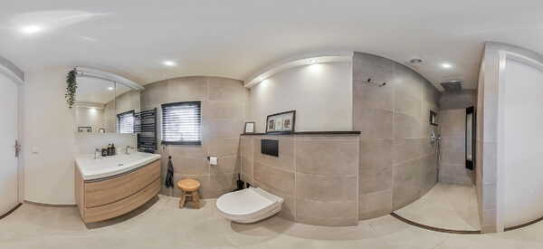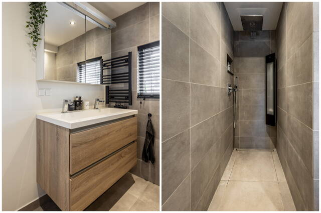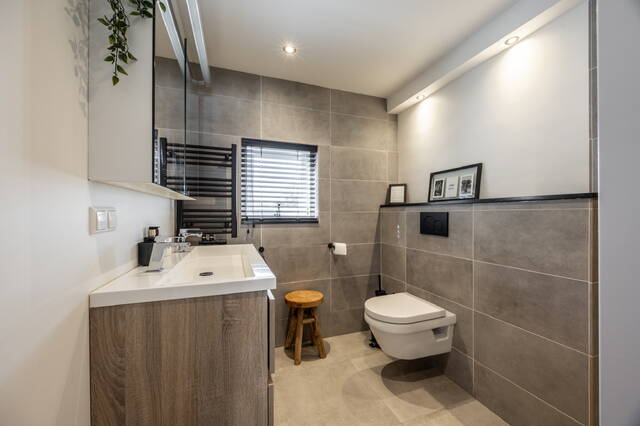 De moderne badkamer is uitgerust met een inloopdouche, wastafelmeubel en een tweede toilet. De lichte kleurstelling en strakke afwerking maken het een frisse en eigentijdse ruimte.