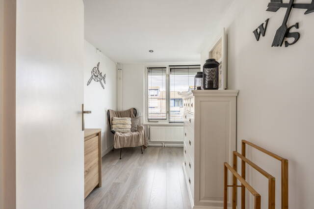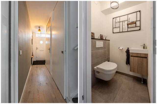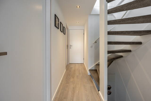 Bij binnenkomst via de voortuin word je in de hal verwelkomd door een prettige sfeer en een verzorgde afwerking. Hier bevinden zich de meterkast, de toiletruimte met fontein, een bergkast, de trapopgang en de toegang tot de woonkamer.