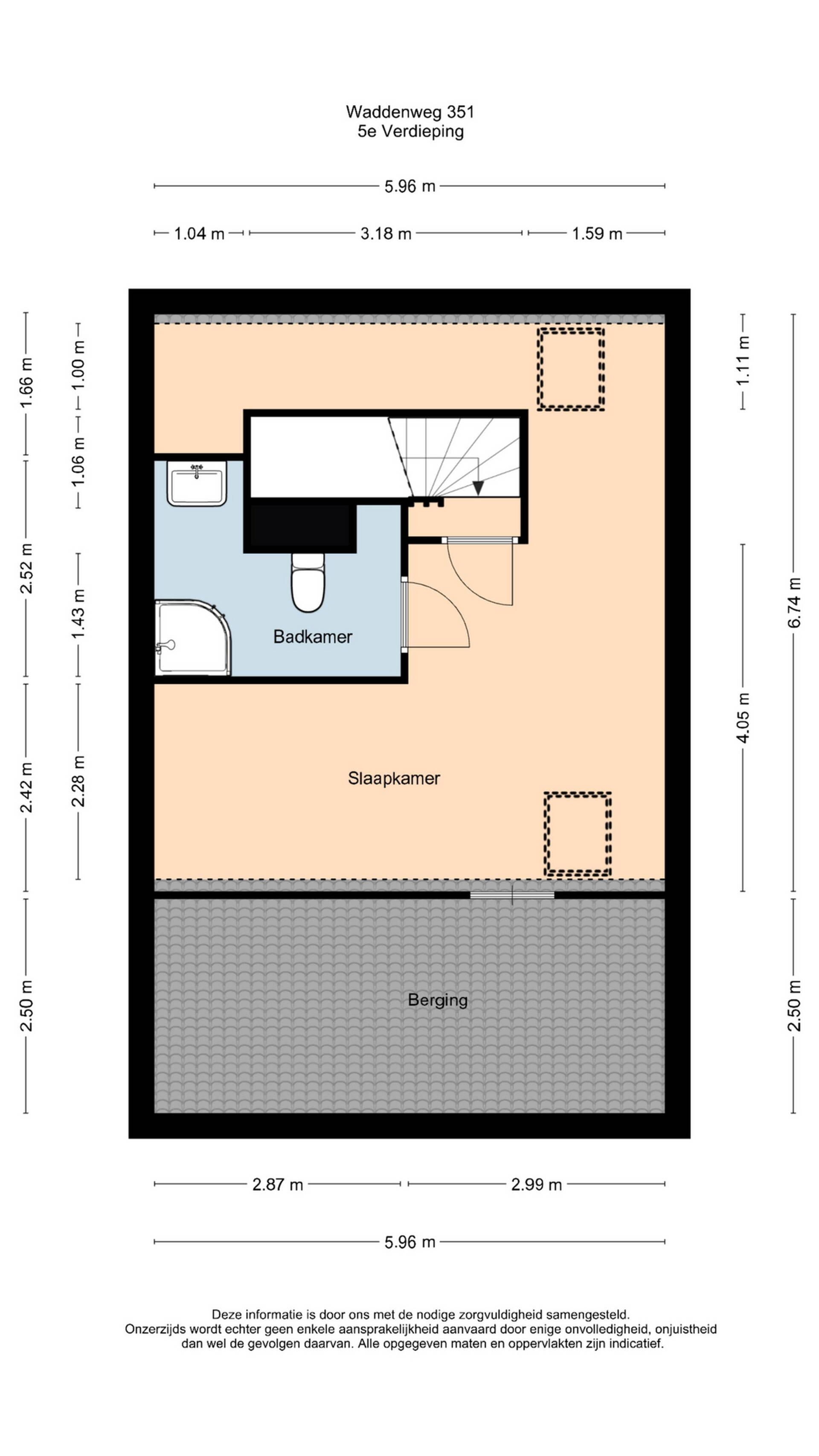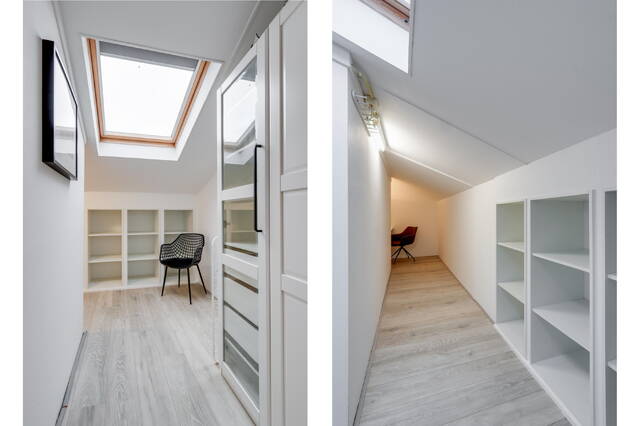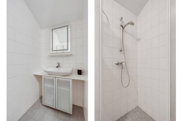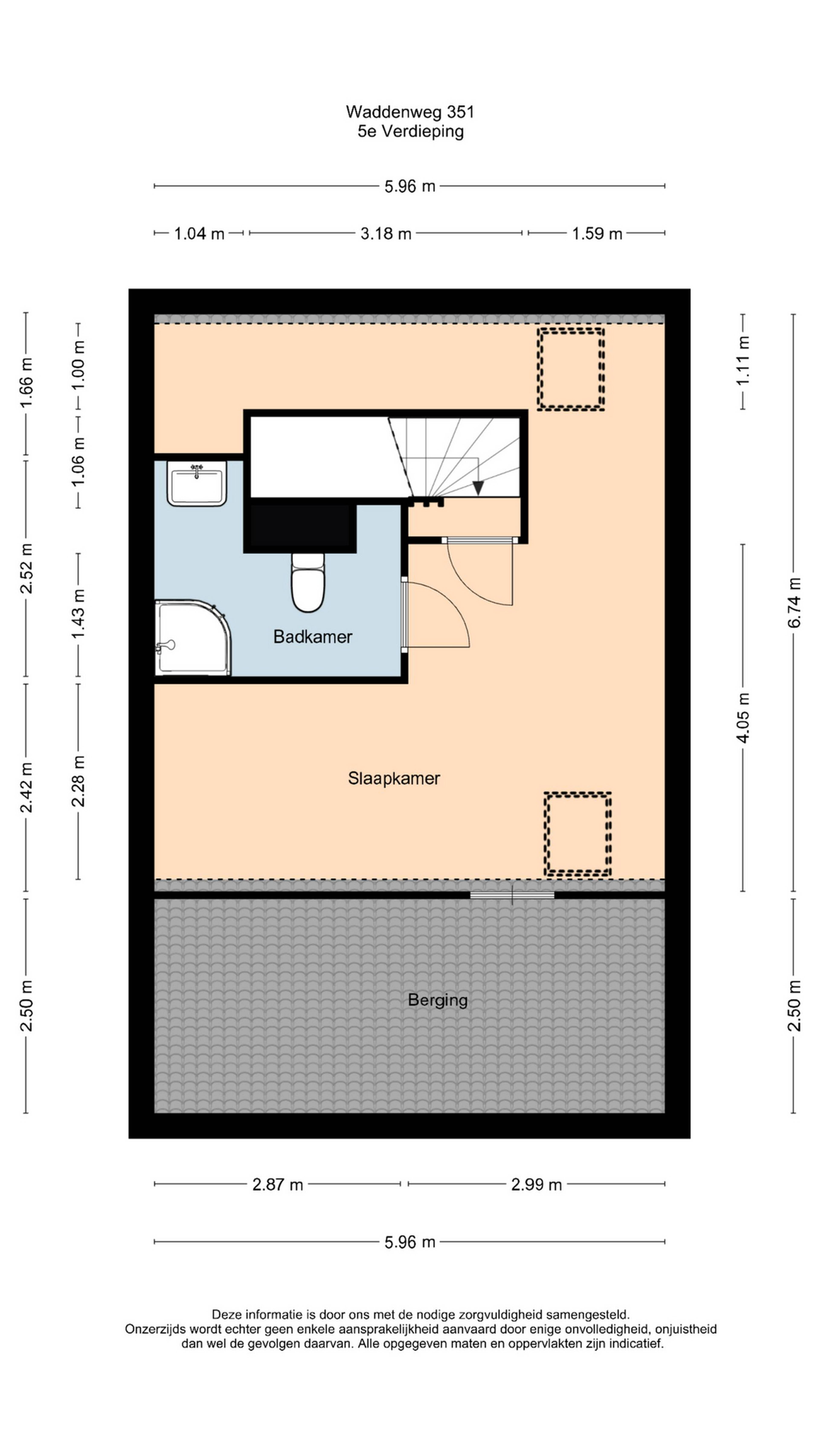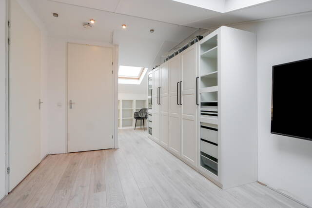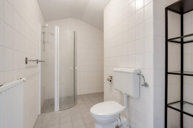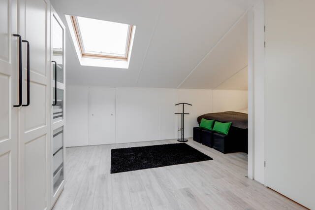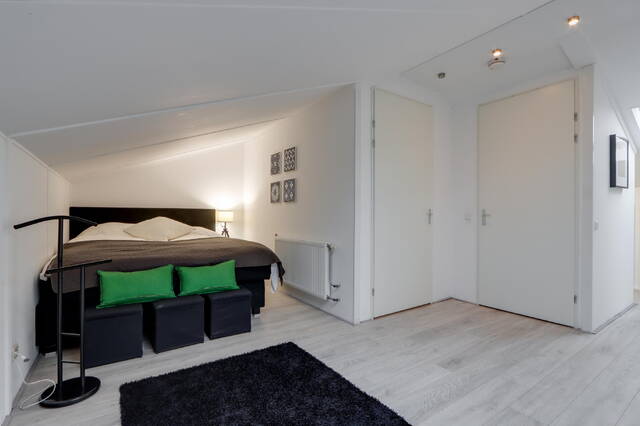Op deze verdieping bevinden zich de ruime slaapkamer en de badkamer. De badkamer is voorzien van een toilet, wastafel met spiegel en een douchecabine. De slaapkamer beschikt over een extra ruimte die ideaal is voor extra opbergruimte, een make-uptafel of een studeer of werkplek. Daarnaast is er onder het schuine dak een verrassend ruime berging aanwezig.