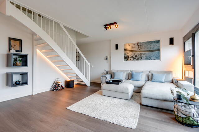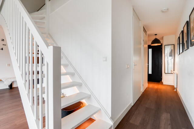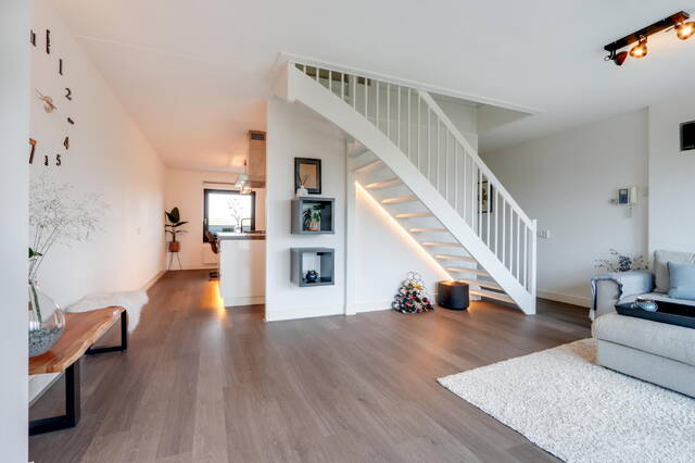 Bij binnenkomst kom je in de hal, waar zich het toilet, de garderobe, het washok en de technische ruimte bevinden. Loop je vanuit de hal door naar de woonkamer. De lichte en sfeervolle woonkamer met Frans balkon biedt een vrij uitzicht over het omliggende groen en de lage bebouwing. De nette open keuken sluit mooi aan op de woonruimte en bevindt zich aan de voorzijde van de woning.