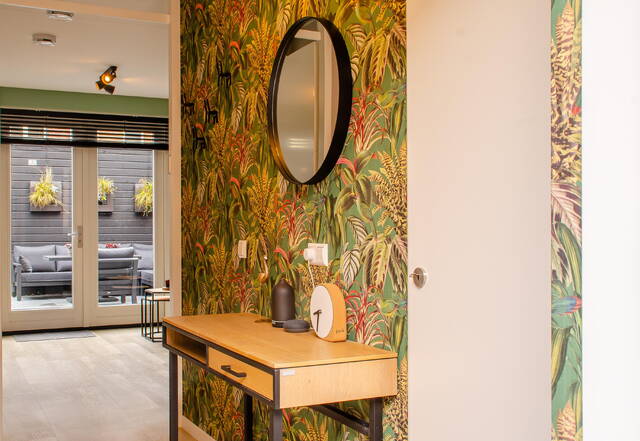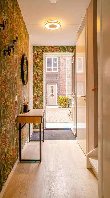 Via de voortuin betreedt u de ruime hal waarvan één muur voorzien is van een mooi design behang, het geheel heeft een luxe uitstaling. Direct links achter de deur vindt u de warmtepomp. Daarnaast is er plaats voor de garderobe en bevindt zich hier het toilet met apart fonteintje en de meterkast.